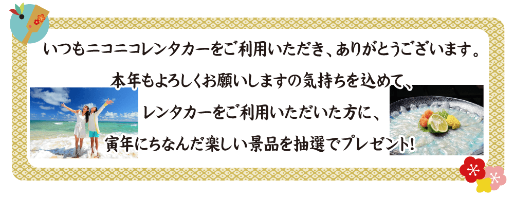 キャンペーン期間中にニコレン公式 会員専用アプリ「ニコパス」でレンタカーをご予約・ご返却いただくだけ! ご当選者には抽選の結果をメールにてご連絡いたします。